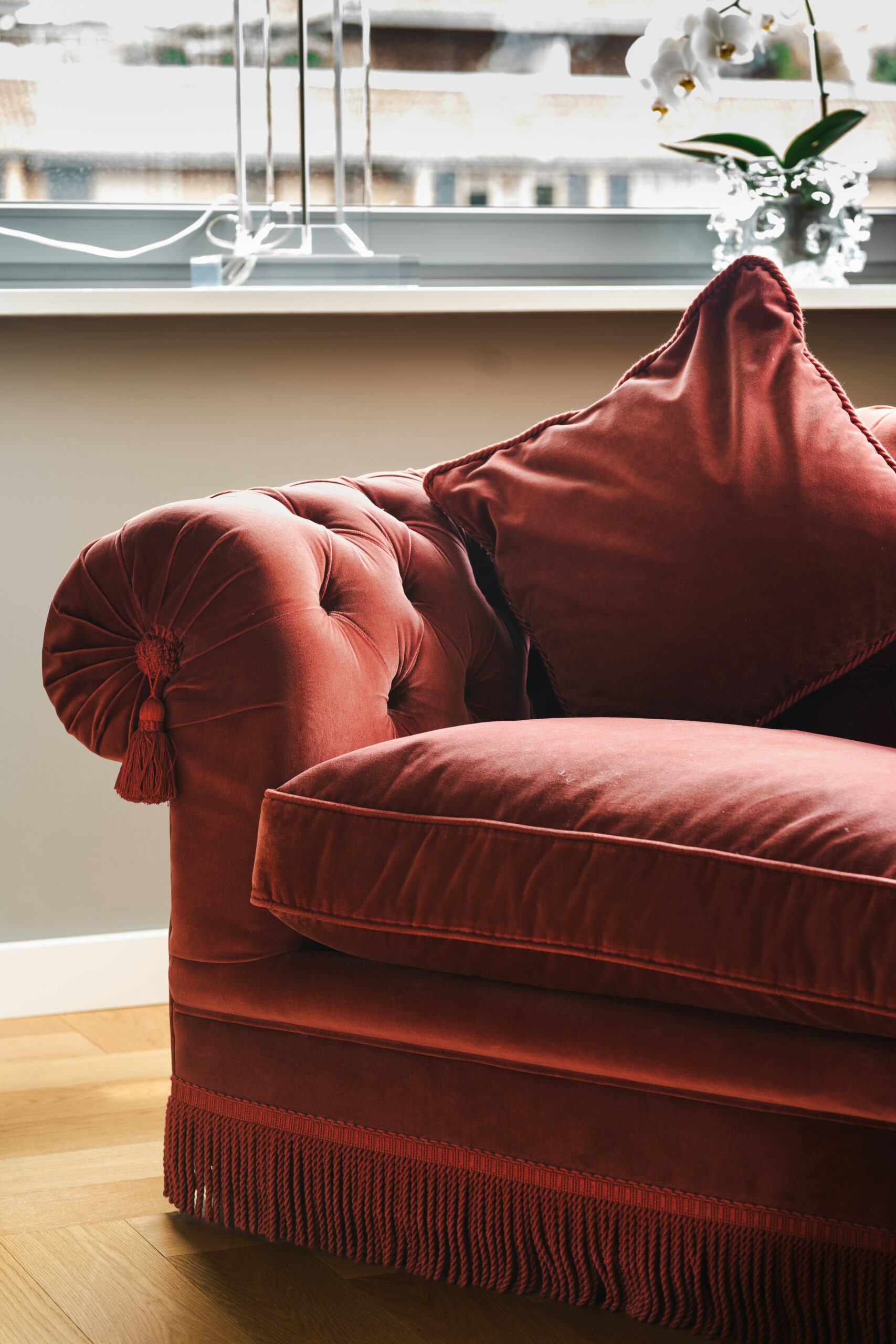 Cushions offer a simple way to adjust the character of a red sofa. For a refined look, combine ivory, taupe or soft grey cushions in linen or velvet. This combination softens vibrancy and introduces calm contrast.