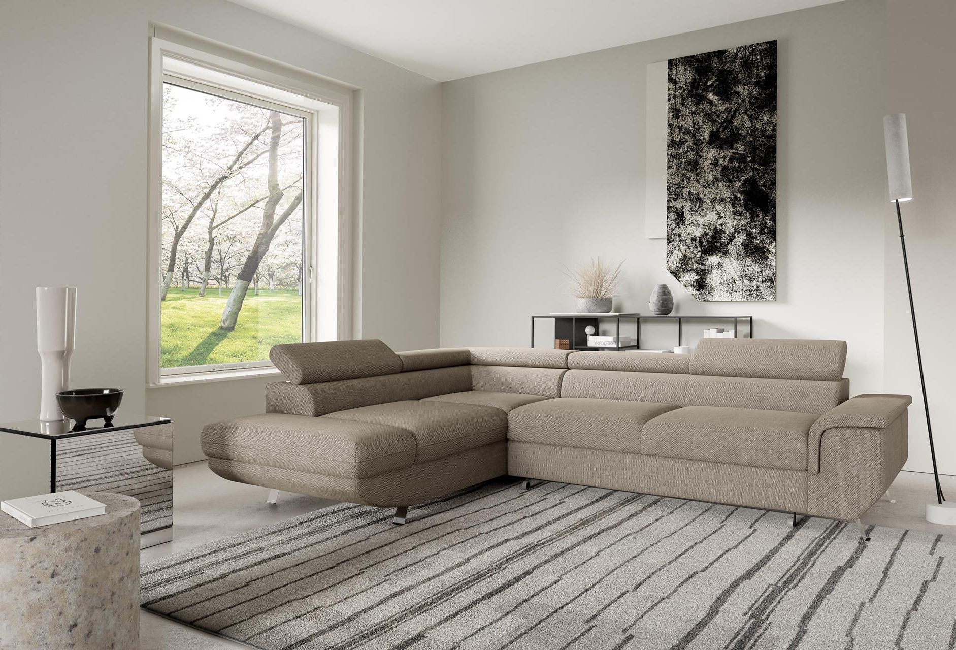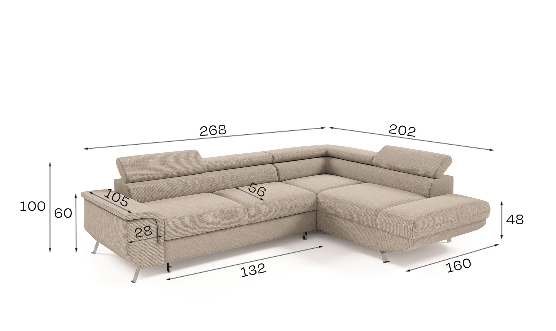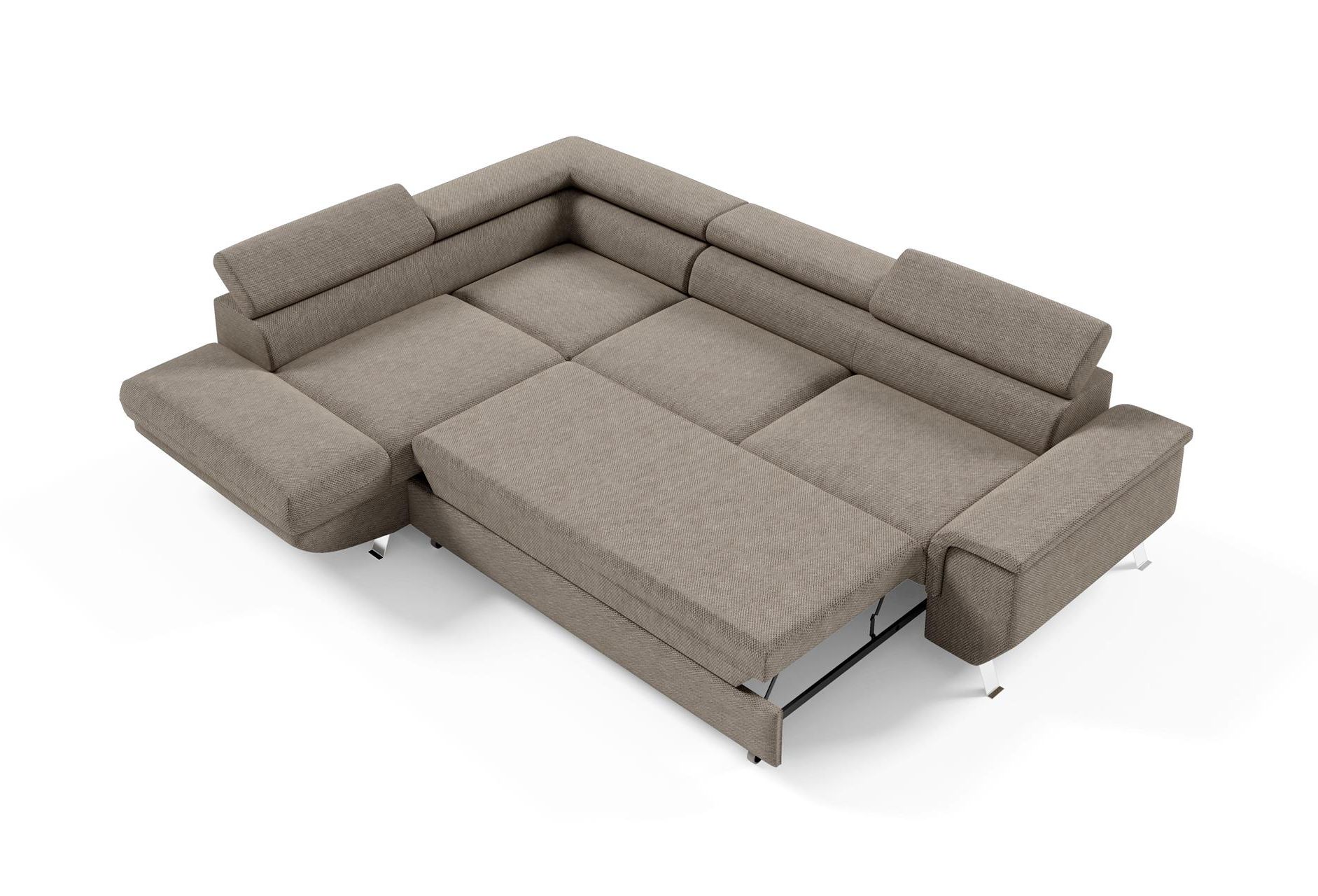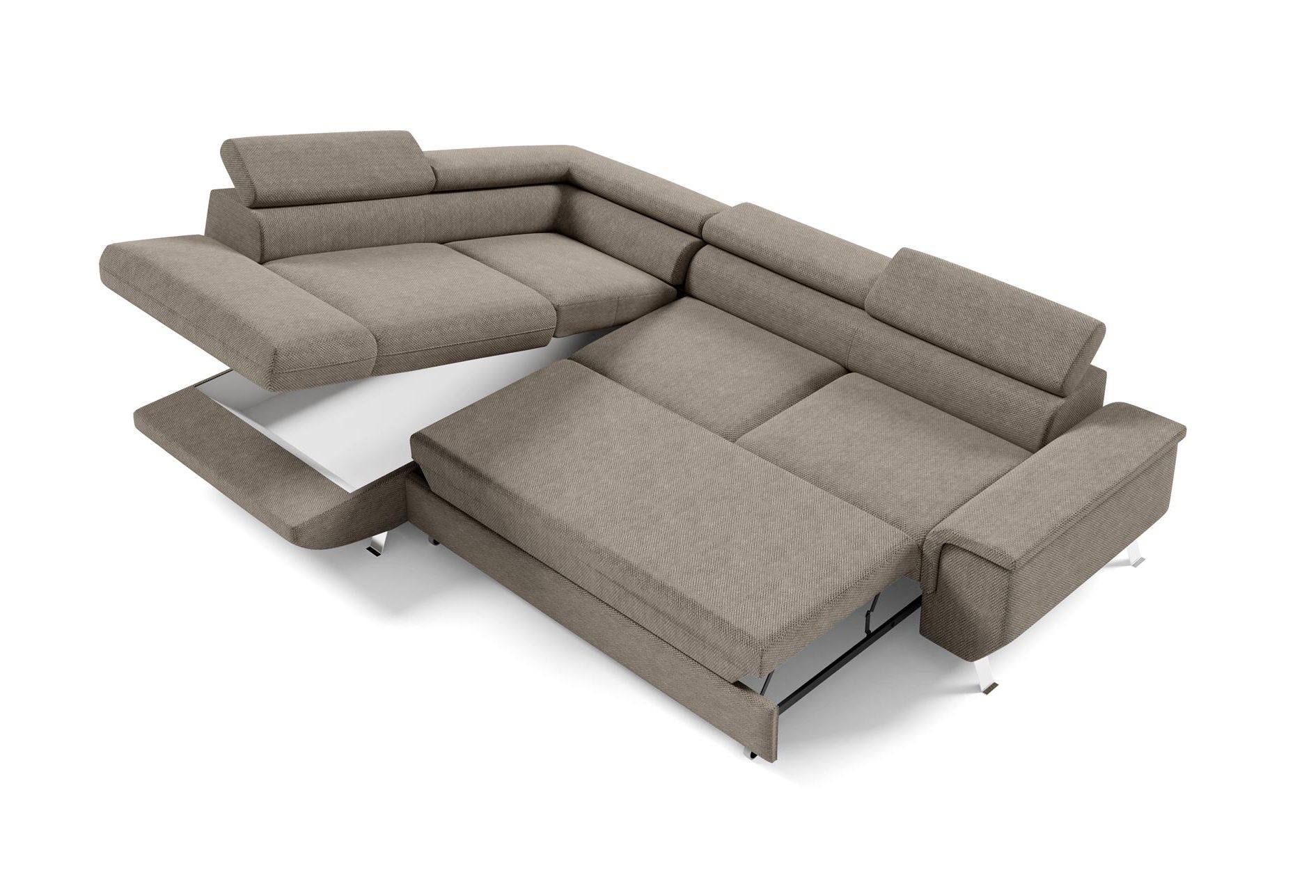 The Arizona Corner Sofa Bed offers modern design with practical functionality, making it perfect for families. Its single padded armrest and subtle curved bottom profile create a sleek, contemporary appearance. Additionally, the sofa sits on sloped metal legs, giving an open, airy feel while maintaining a stylish, low-profile look. Fully upholstered with fixed cushions and two adjustable headrests, it combines comfort with a clean, modern aesthetic.