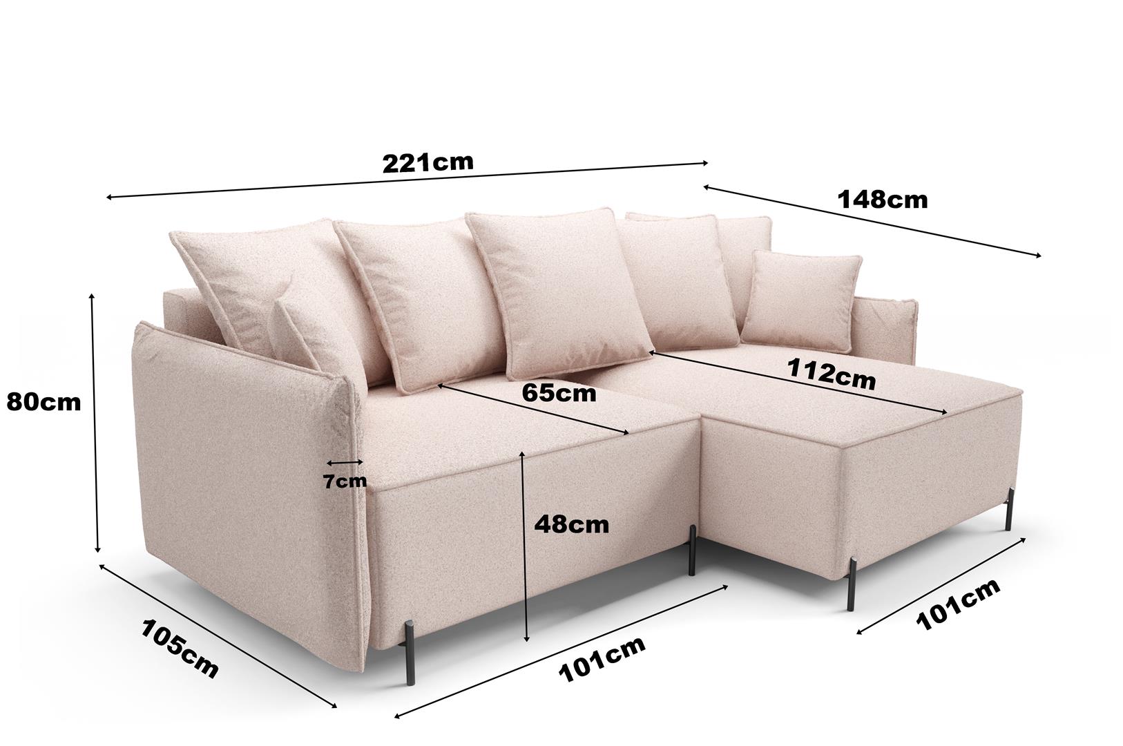This sofa includes five large and two small scatter cushions, providing excellent support and comfort. In addition, the laminate underseat storage offers a convenient place to store blankets, bedding, or other essentials. The DL mechanism allows a smooth transformation from sofa to bed. Simply remove the back cushions, slide the smaller seat section outward, and fold the backrest flat to create a double sleeping area measuring 204cm x 135cm. As a result, it is perfect for overnight guests or family movie nights.