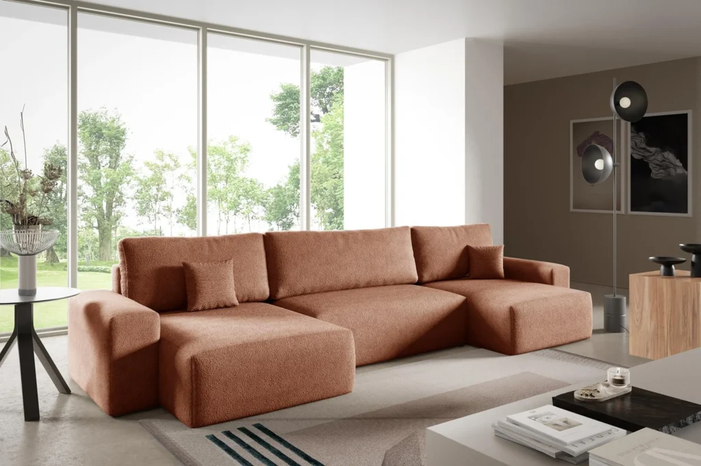 The Centaur U Shaped Sofa Bed combines generous seating with a sleek, modern design. Its wide armrests and low profile create a bold contemporary style, while the sofa sits flush to the floor for a seamless finish. Moreover, this design prevents items from slipping underneath, making it perfect for busy households.