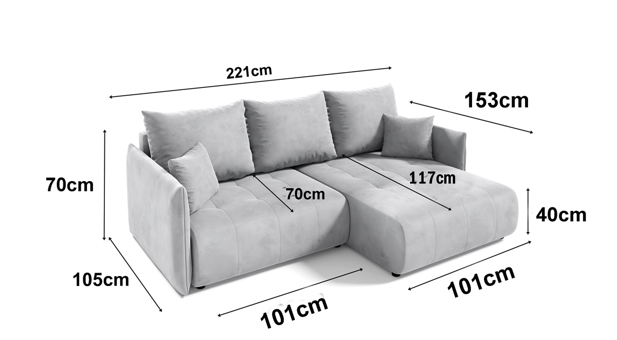 This sofa comes with three large back cushions and two scatter cushions, providing excellent comfort and support. In addition, it includes underseat storage, giving you a practical place to keep bedding, blankets, or everyday essentials. The DL mechanism makes sofa-to-bed conversion simple: remove the back cushions, slide out the smaller seat section, and fold the backrest flat to create a spacious sleeping surface. As a result, the Henry Mini Corner Sofa Bed works perfectly for both everyday living and overnight guests.