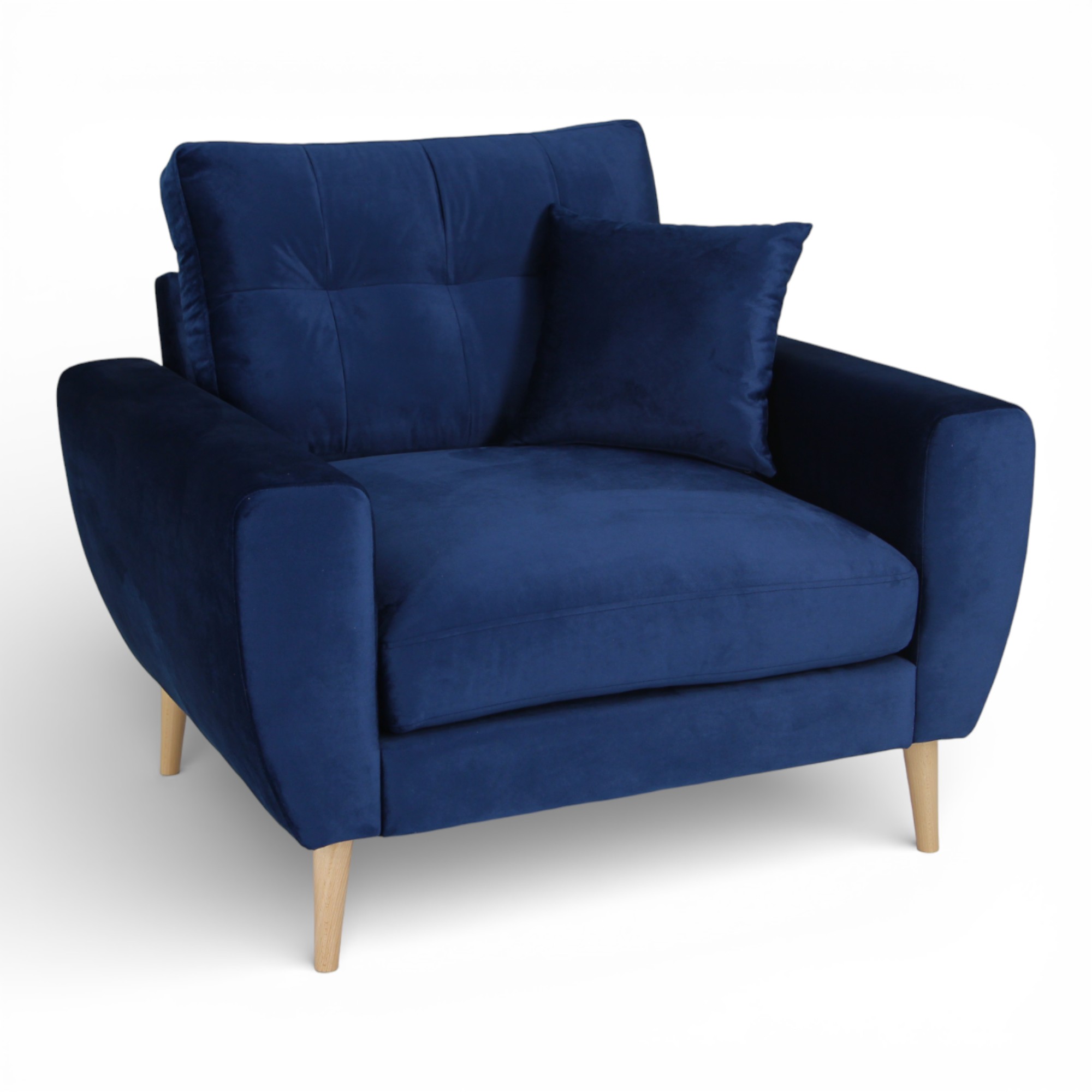 Tufted upholstery on the back cushion adds subtle texture and depth, creating a tailored and elegant finish. The armrests feature gentle curves along the sides, which soften the silhouette, while the flat-topped arms provide a practical surface for a book or cup of tea. The chair stands on sturdy wooden legs, enhancing its classic appeal and leaving enough space underneath for easy hoovering. In addition, it comes with one matching scatter cushion for added comfort and a cohesive look.