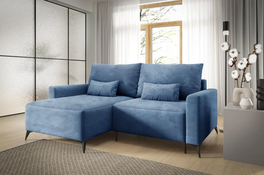 The Loft Corner Sofa Bed combines a compact design with modern style. Medium-width armrests and clean lines give the sofa a bold, contemporary appearance. Moreover, slim metal legs raise the sofa off the floor, creating a light, airy feel while maintaining a sleek silhouette.