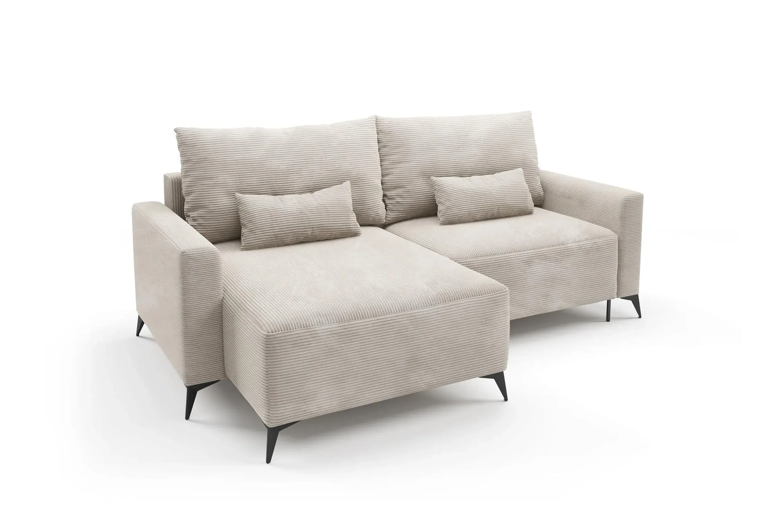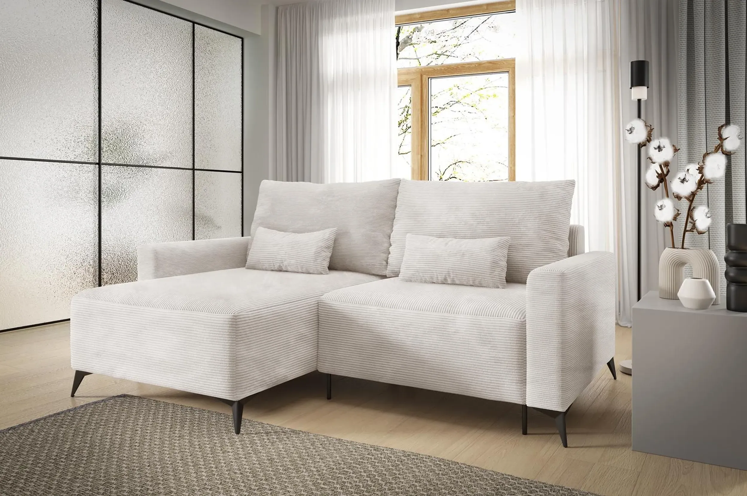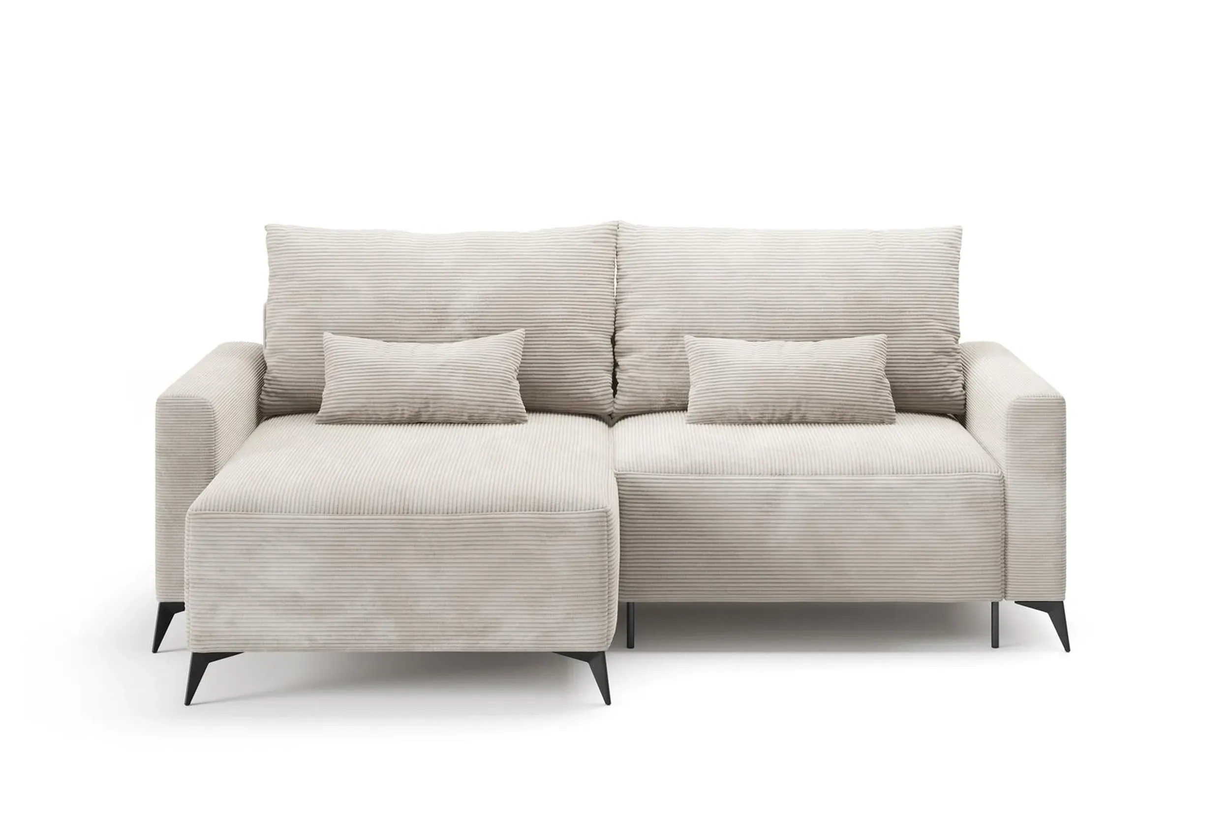 This sofa includes two large back cushions and two lumbar cushions, offering excellent support for lounging. In addition, the DL mechanism lets you convert the sofa into a bed quickly: remove the back cushions, pull out the seat section, and fold down the backrest to create a flat sleeping surface. The underseat storage holds bedding, blankets, or daily essentials, keeping your living space tidy. As a result, the Loft Corner Sofa Bed works perfectly for compact living spaces or hosting overnight guests.
