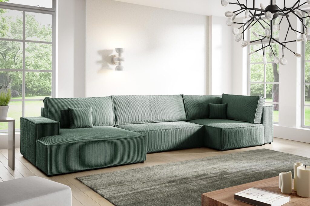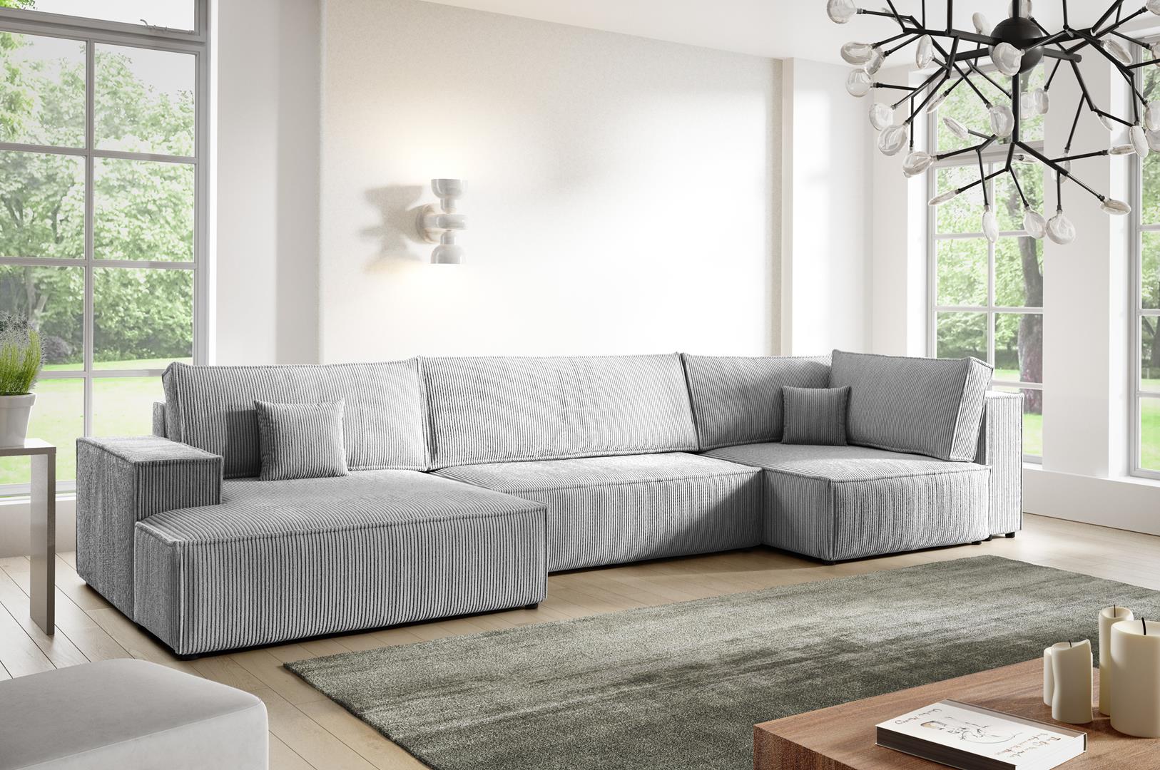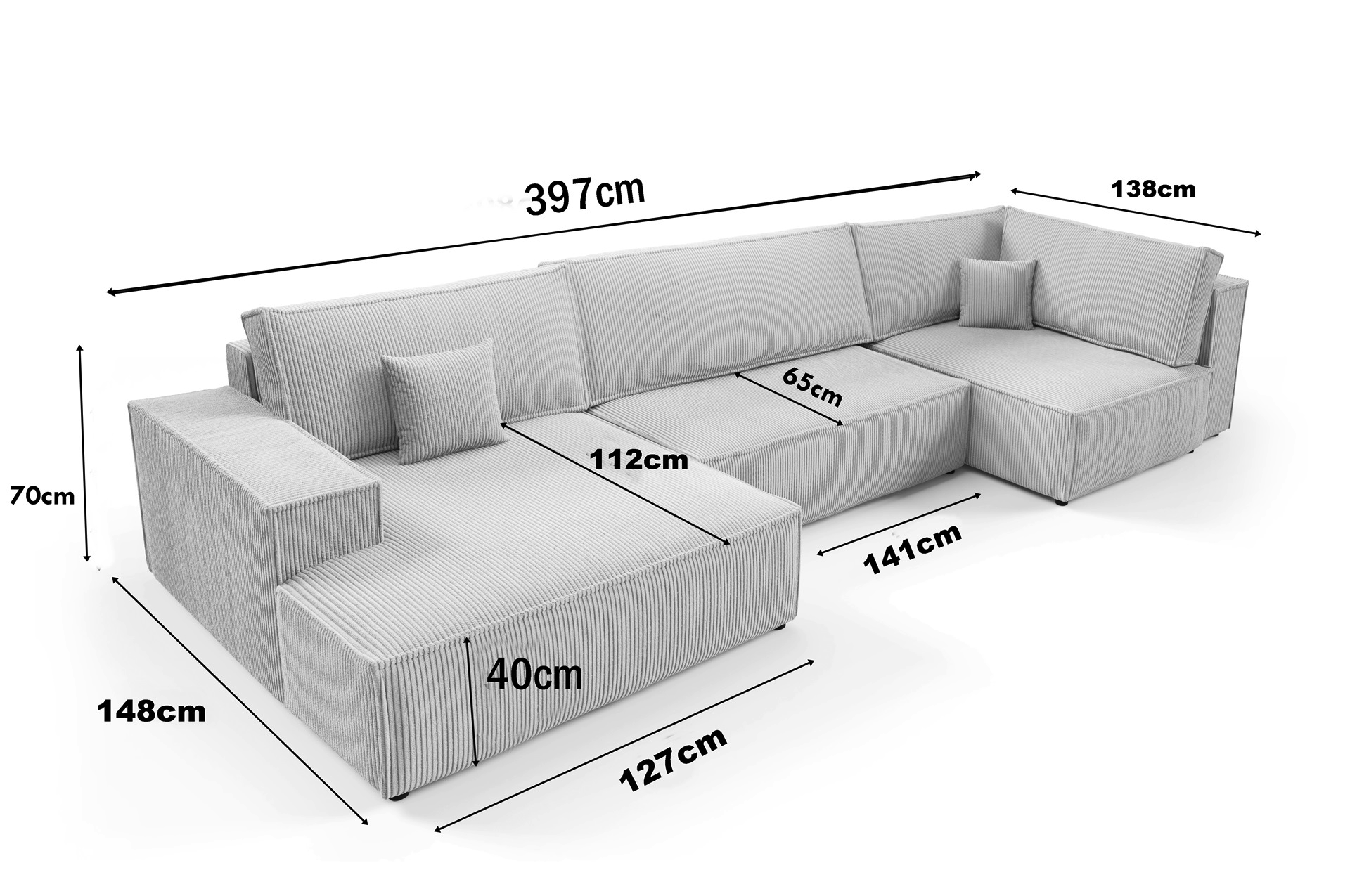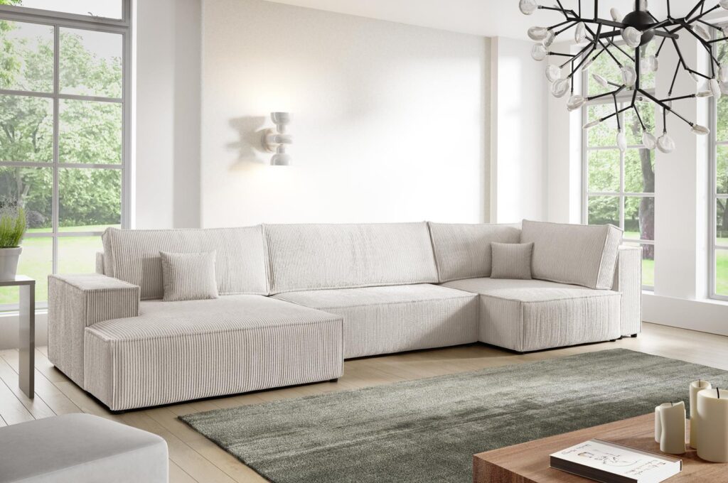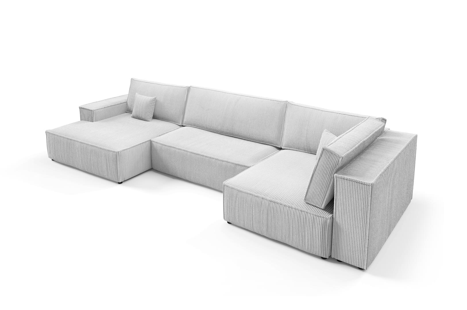 The Max Extended Back U Shaped Sofa Bed combines modern design with versatile comfort. Its block, angular frame creates a bold statement, while piping details emphasise clean, straight lines. Wide, chunky armrests add both style and support. Moreover, the extended backrest wraps around one of the chaise sections, offering more placement options in any room. One side features a traditional armrest, while the other includes the extended back for added support and versatility. Sitting flush to the floor, the sofa gives a sleek, seamless appearance while preventing small items from slipping underneath.