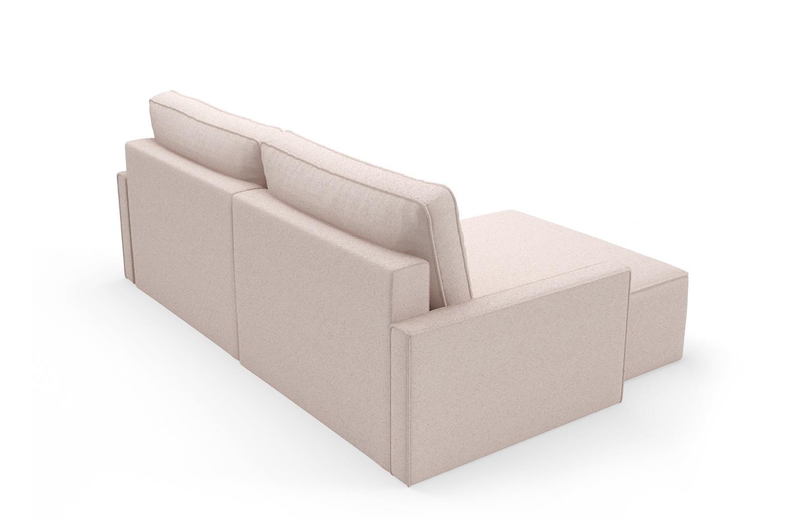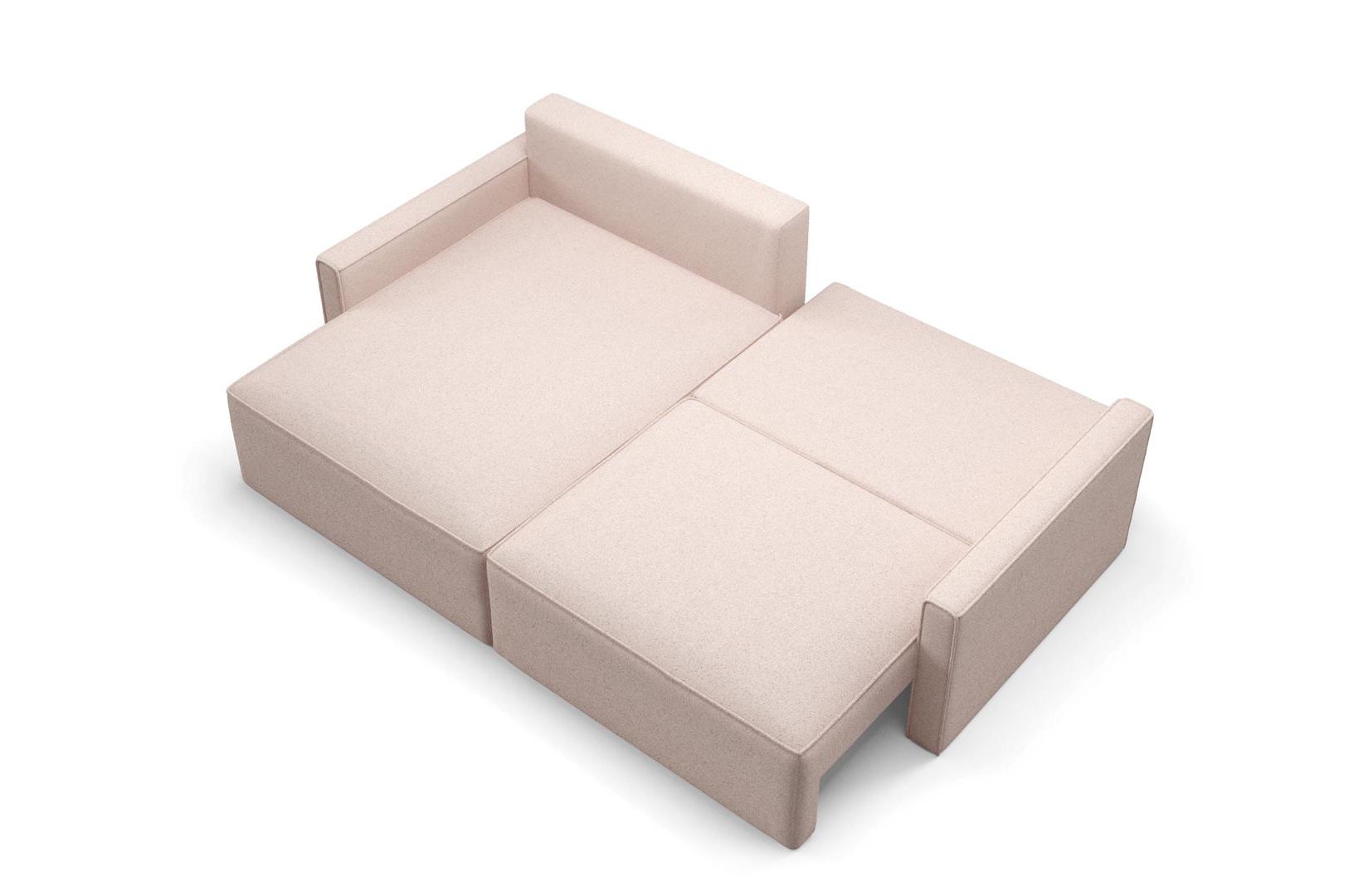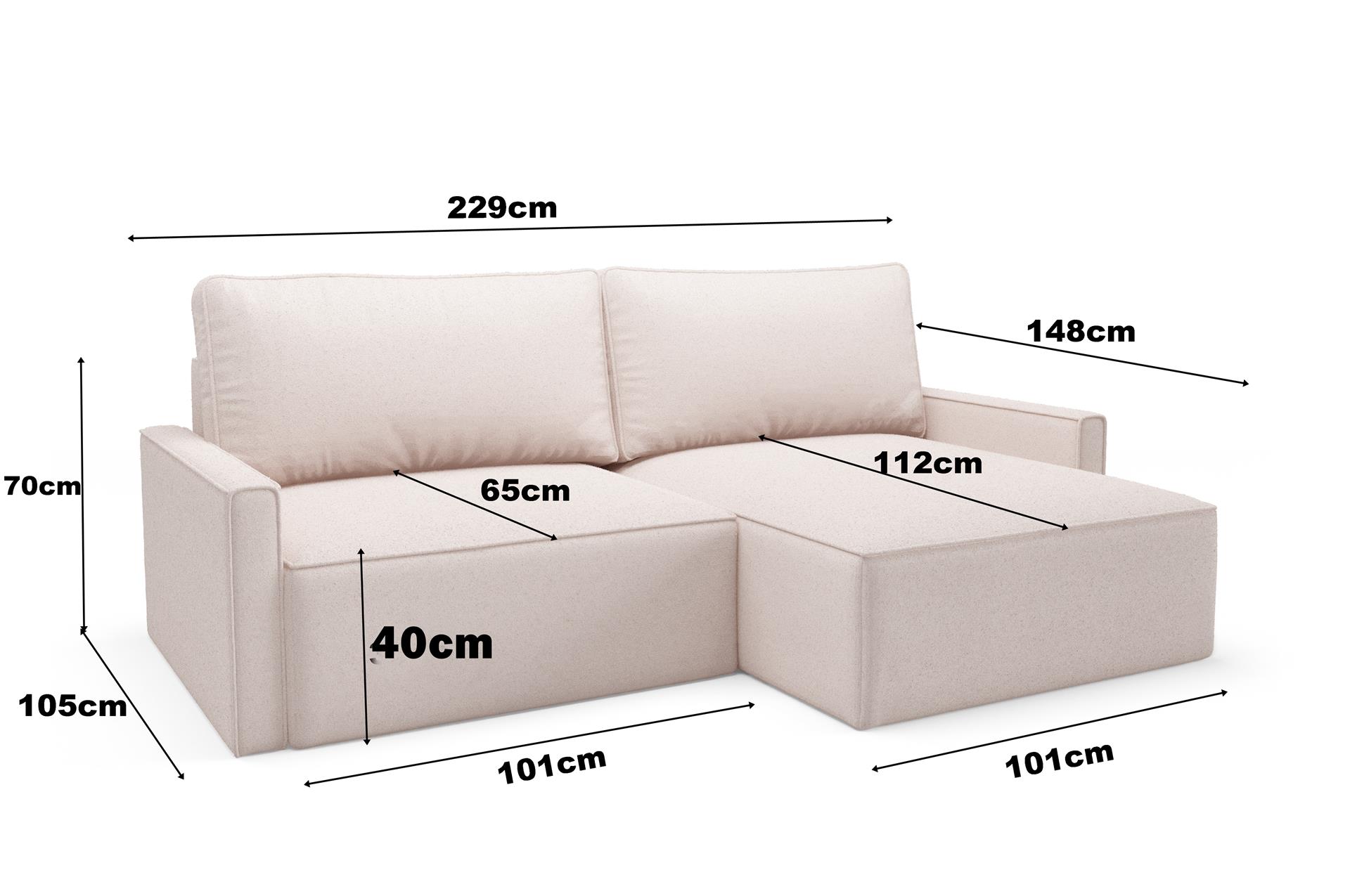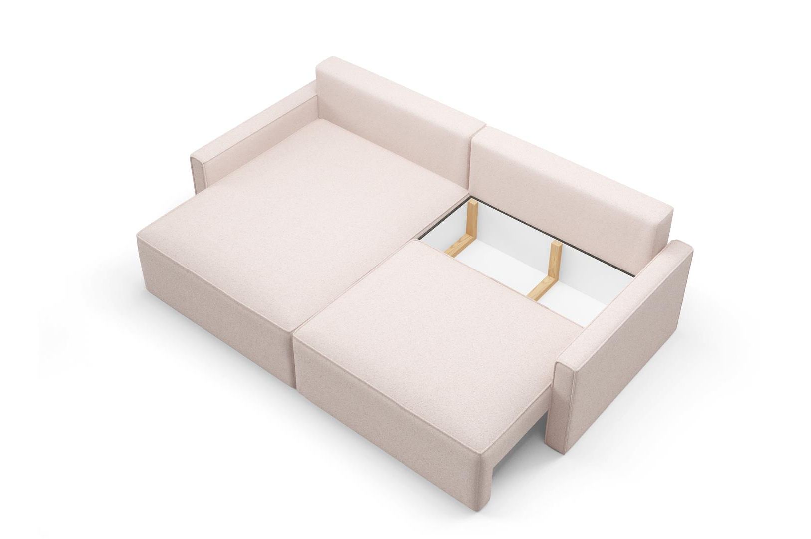 This sofa includes two large back cushions, providing excellent support for lounging. In addition, the DL mechanism converts the sofa into a bed easily: remove the back cushions, pull out the seat section, and fold down the backrest to create a flat sleeping surface. The underseat storage holds bedding, blankets, or everyday essentials, keeping your living space organised. As a result, the Mini New Corner Sofa Bed is ideal for compact living spaces and overnight guests.