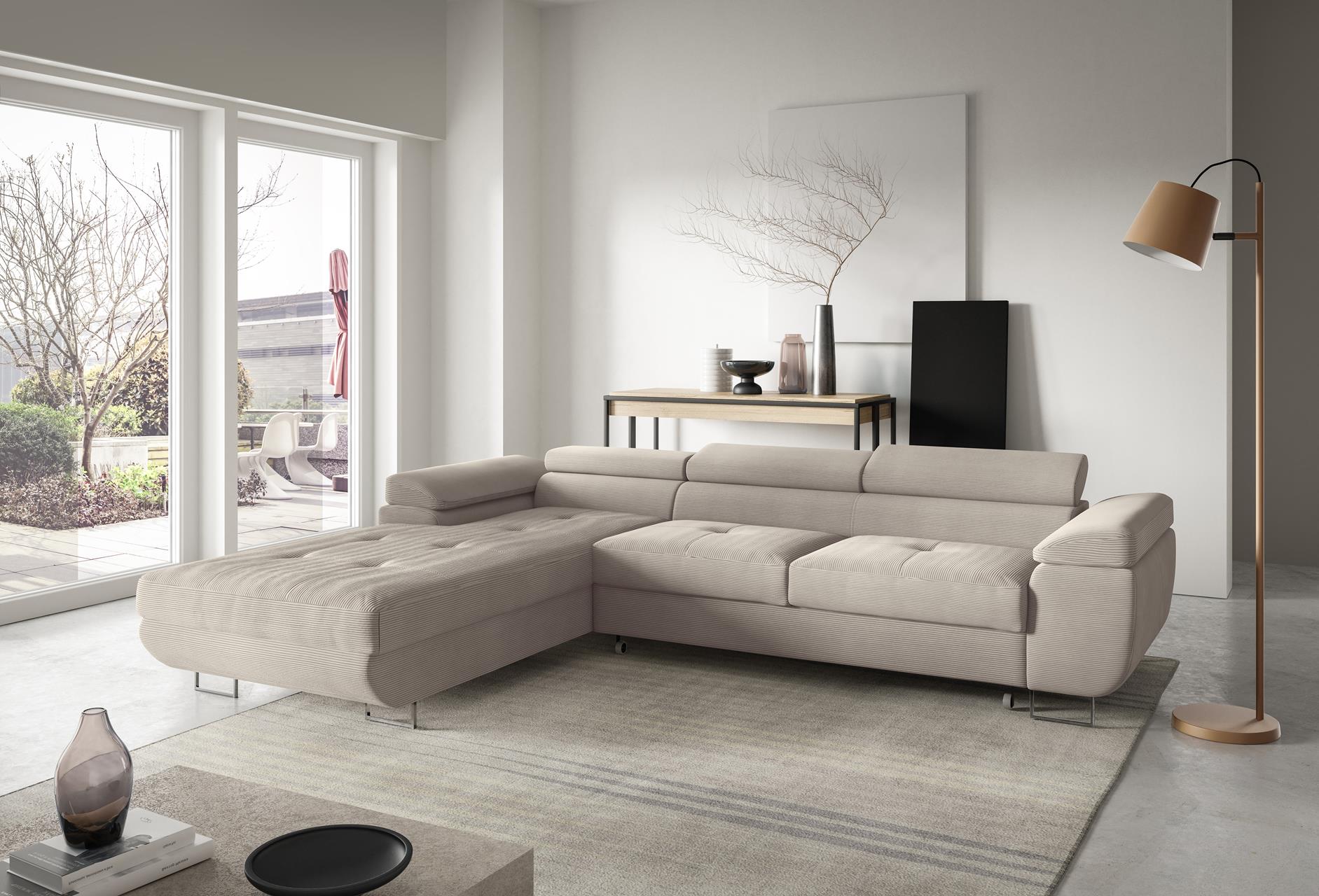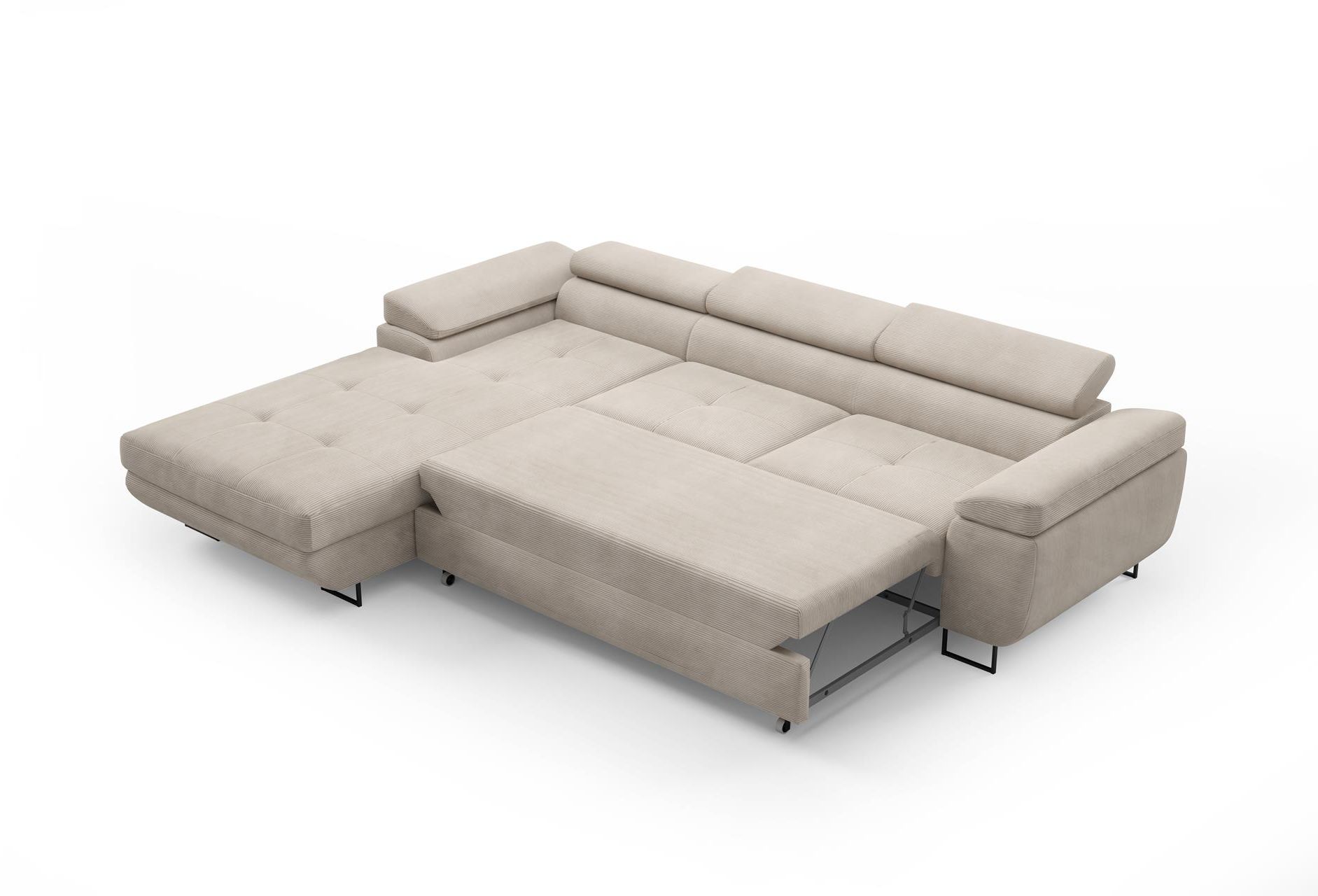 The Oslo Corner Sofa Bed blends modern design with practical functionality, making it ideal for families. Its two padded armrests and subtle curved bottom profile add style and elegance. Additionally, button-tufted upholstery on the seats enhances visual appeal and keeps the foam in place longer. The sofa sits on sleek metal legs, creating an open and airy feel. Fully upholstered with fixed cushions and adjustable headrests, it combines comfort with a contemporary, low-profile design.