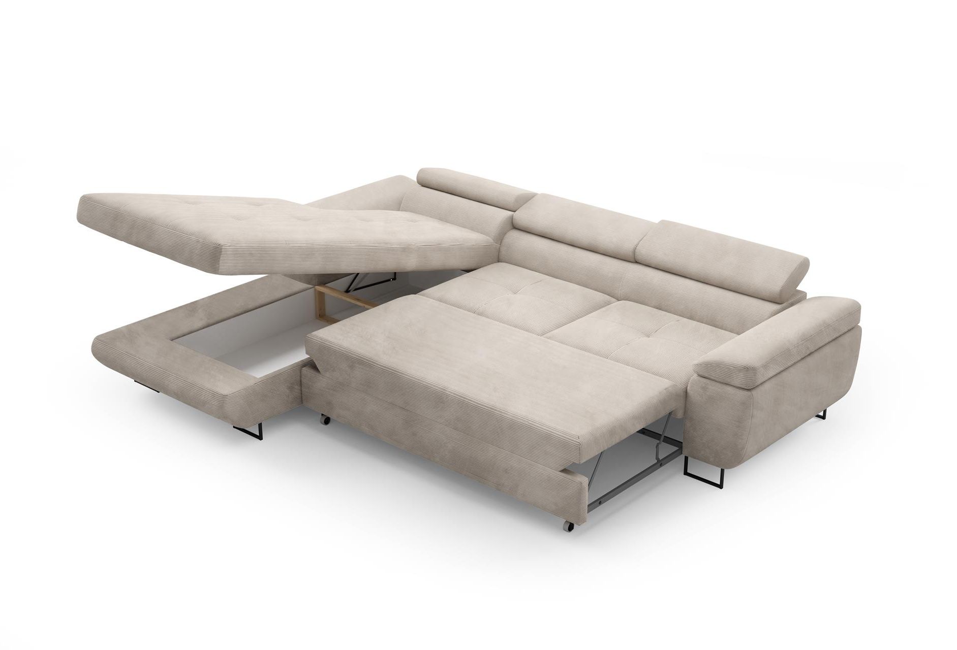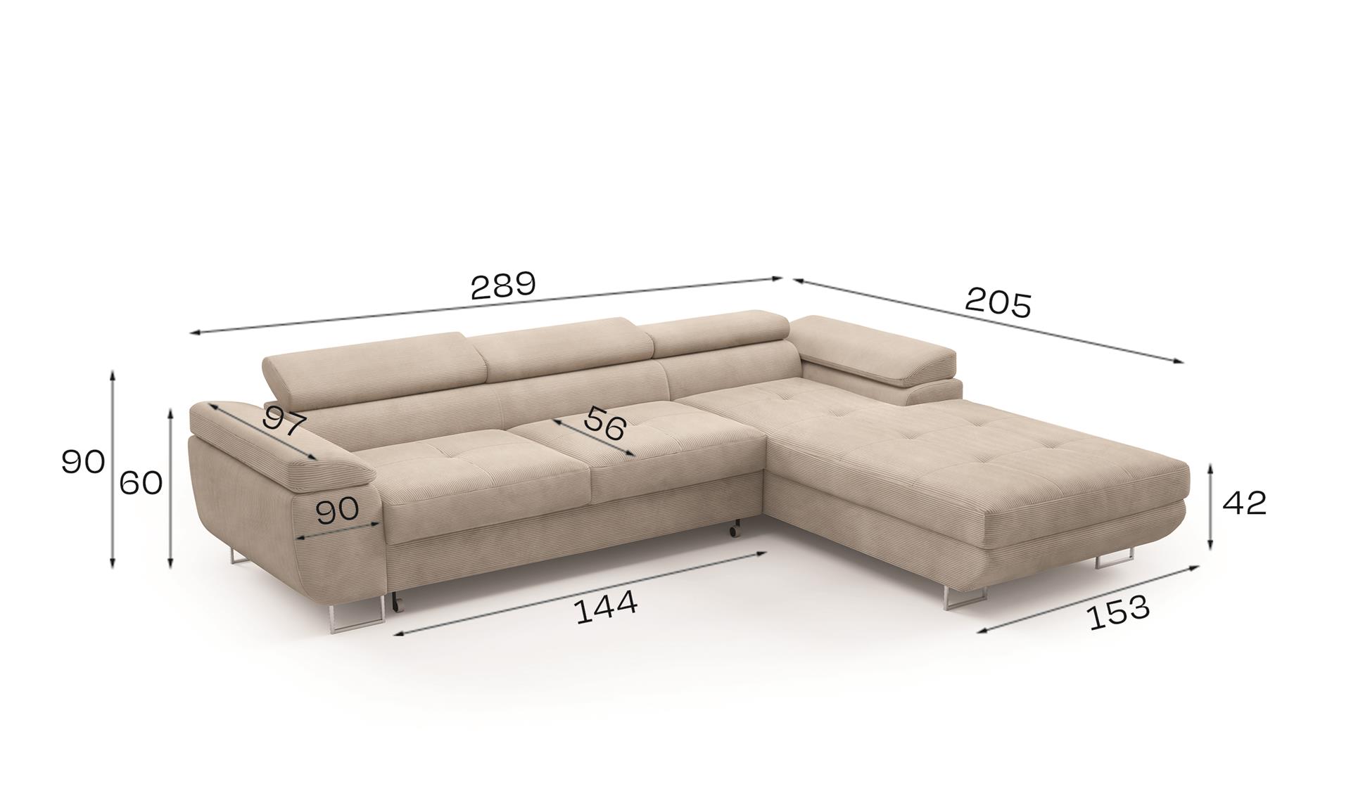 This sofa features tilting adjustable headrests for personalised support. Moreover, the DELFIN-style bed system lets you convert the sofa into a flat sleeping area quickly. Simply pull out the base of the seat section, which lifts to form the bed. In addition, you can easily access the large underseat storage by lifting the chaise. It provides ample space for blankets, bedding, or everyday essentials. Therefore, the Oslo Corner Sofa Bed suits family living and hosting overnight guests.