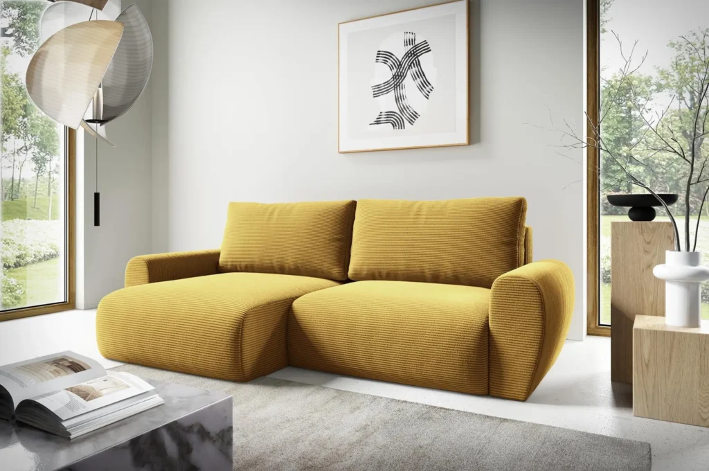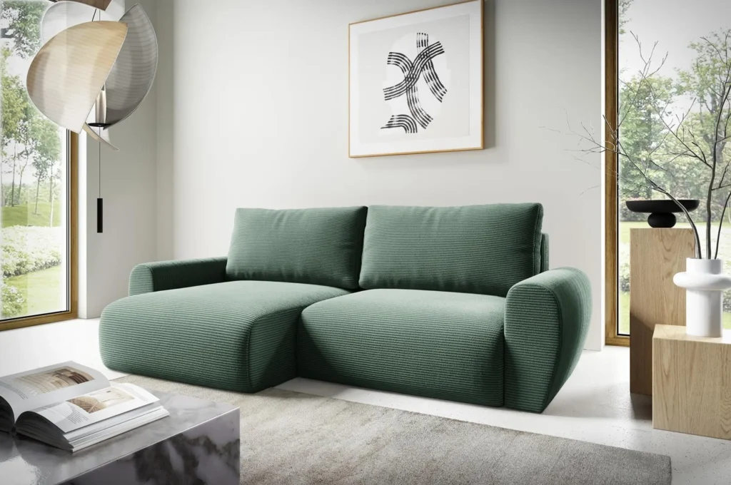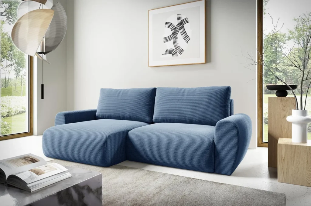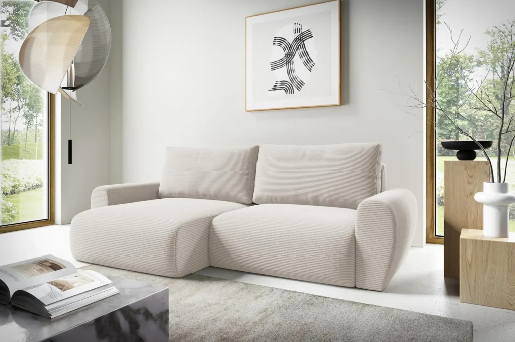 The Poss Corner Sofa Bed combines compact design with modern style. Its curved armrest adds both elegance and visual impact. Moreover, the sofa sits flush to the floor, creating a sleek, seamless look while keeping small items from slipping underneath.