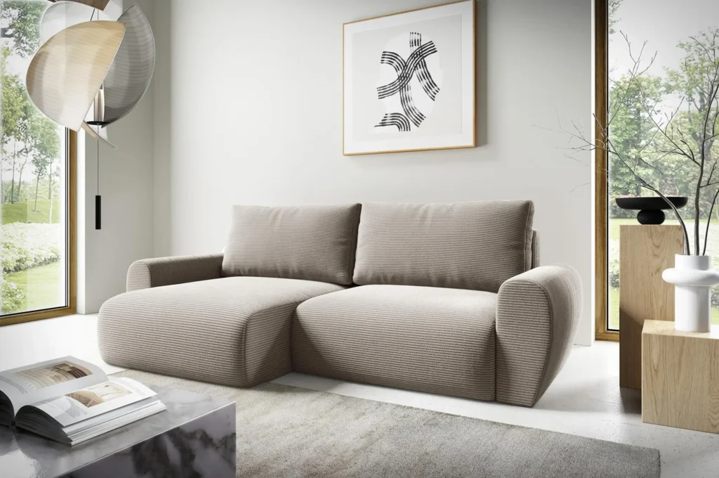 This sofa includes two large back cushions, offering comfortable support for everyday lounging. In addition, the DL mechanism converts the sofa into a bed in just a few steps: remove the back cushions, pull out the seat section, and fold down the backrest to create a flat sleeping surface. Furthermore, the underseat storage provides a practical space for blankets, bedding, or essentials. As a result, the Poss Corner Sofa Bed works perfectly for compact living areas and overnight guests.