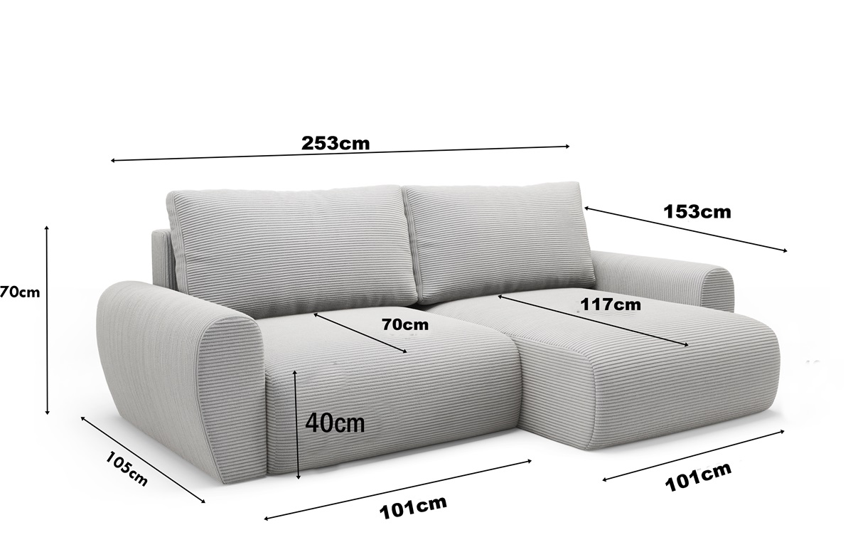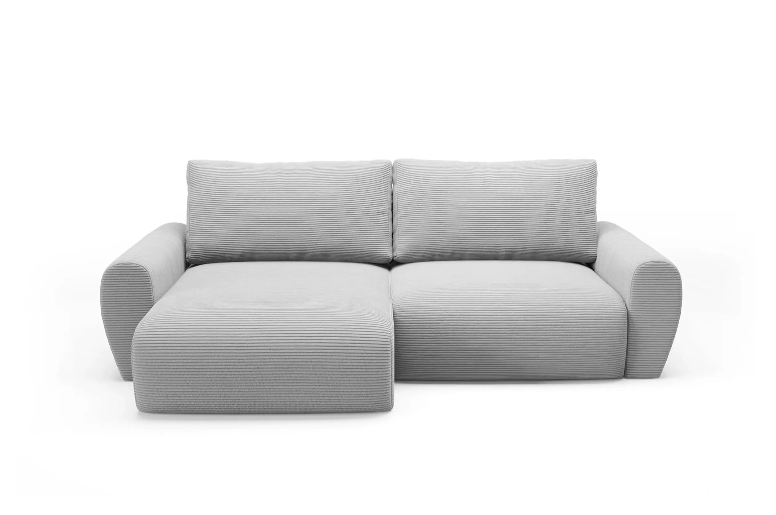 This sofa includes two large back cushions, offering comfortable support for everyday lounging. In addition, the DL mechanism converts the sofa into a bed in just a few steps: remove the back cushions, pull out the seat section, and fold down the backrest to create a flat sleeping surface. Furthermore, the underseat storage provides a practical space for blankets, bedding, or essentials. As a result, the Poss Corner Sofa Bed works perfectly for compact living areas and overnight guests.