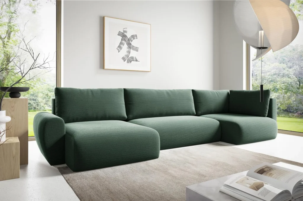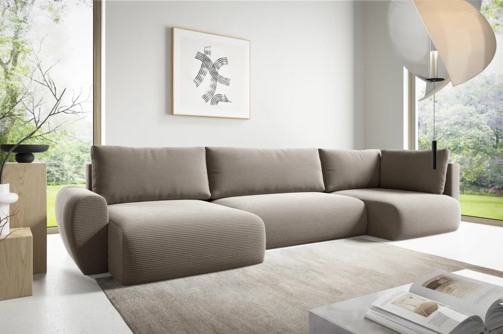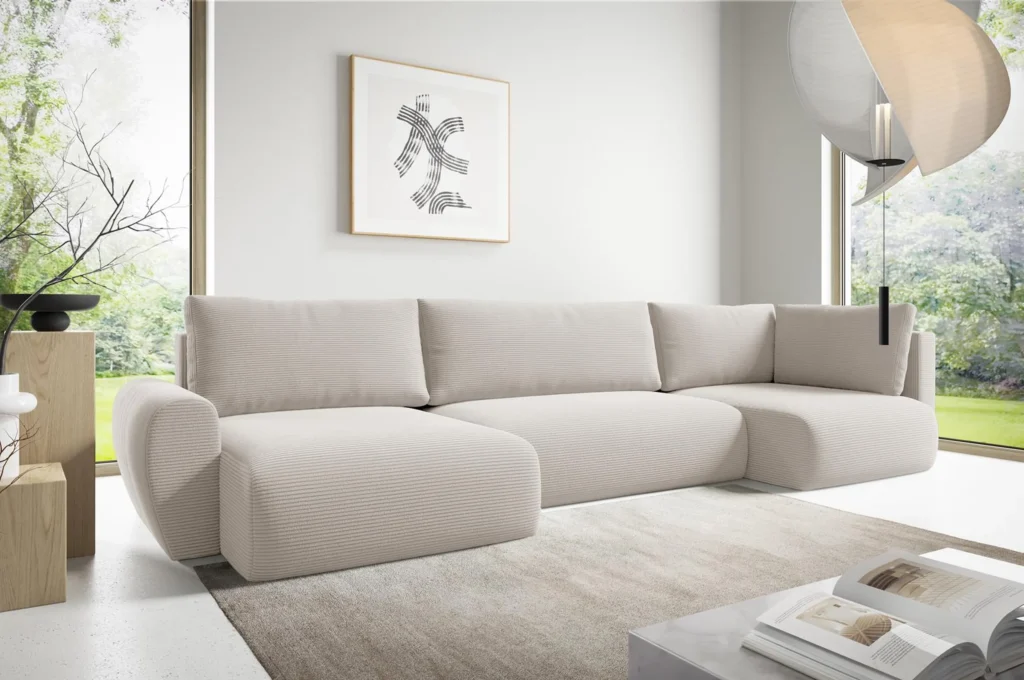 The Poss Extended Back U Shaped Sofa Bed combines large-scale comfort with contemporary design. Its extended backrest wraps around the chaise section, giving you more placement options in any room. One side includes a traditional armrest, while the other side features the extended back, adding extra support and versatility. Moreover, the curved armrest enhances the look with a modern touch. The sofa also sits flush to the floor, creating a sleek, seamless appearance while preventing small items from slipping underneath.