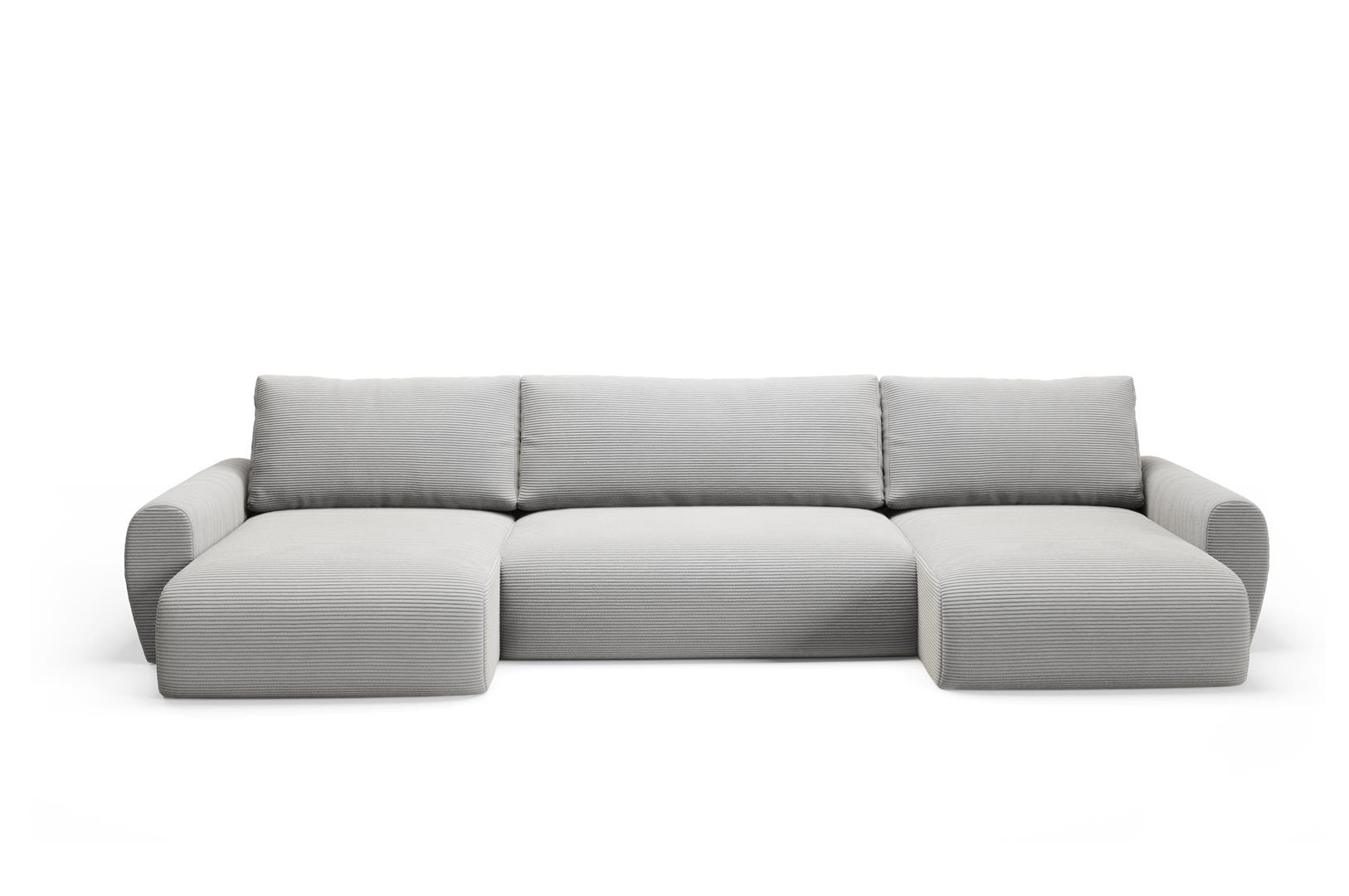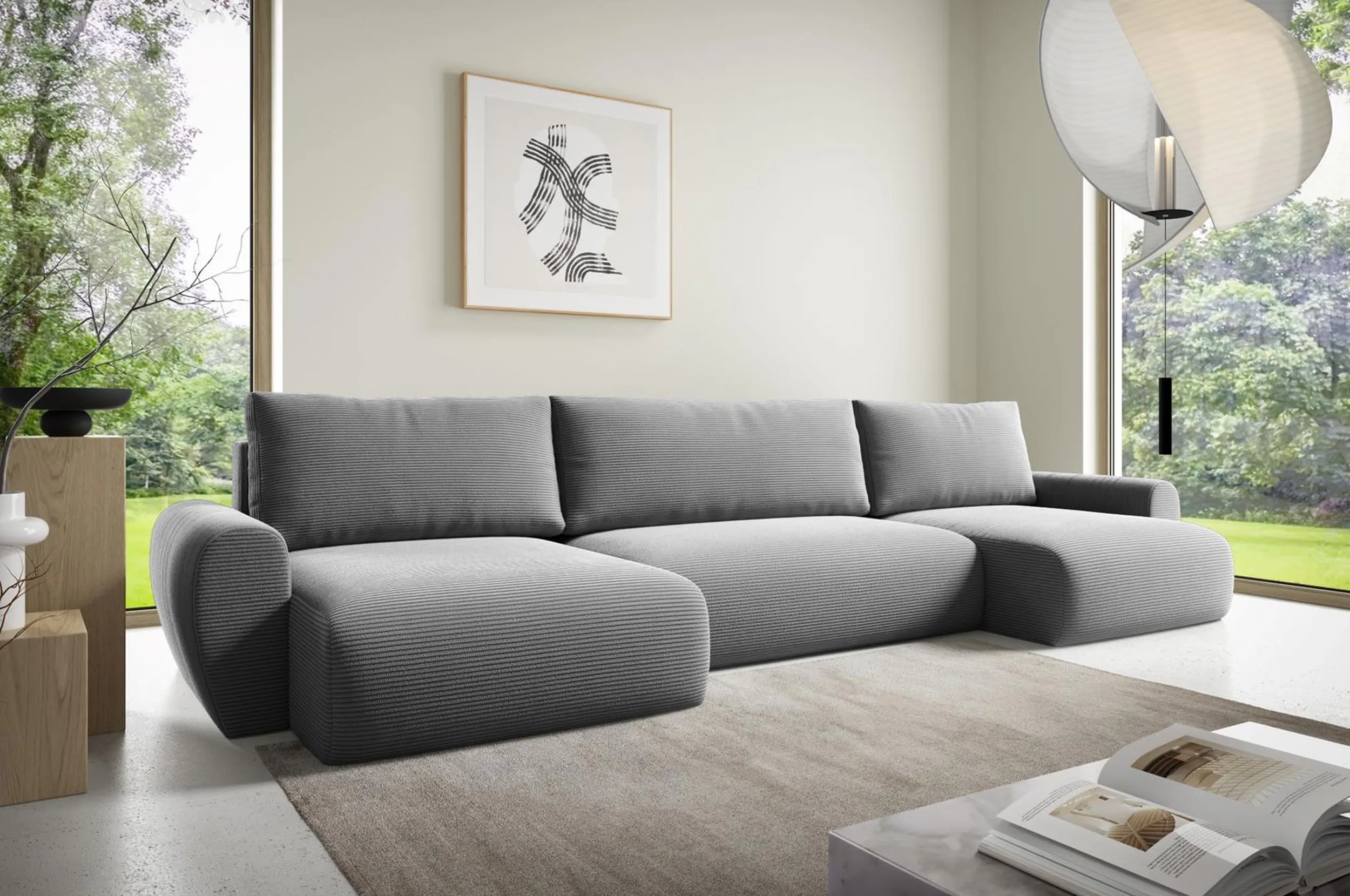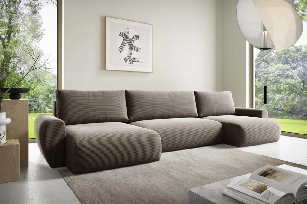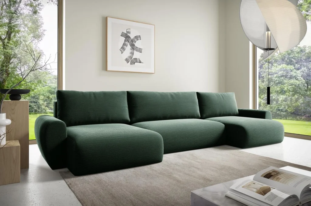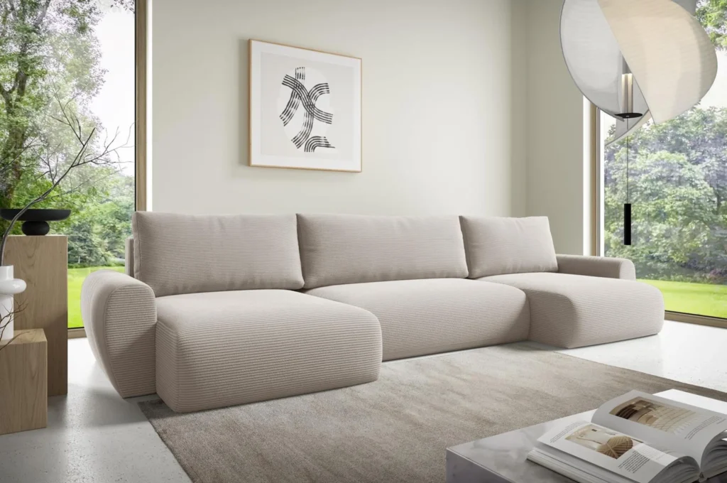 The Poss U Shaped Sofa Bed combines generous seating with modern design. Its curved armrest adds both comfort and style, giving the sofa a striking look. Moreover, the fully upholstered finish allows you to place it anywhere in your room. Sitting flush to the floor, it creates a sleek, seamless appearance while preventing small items from being lost underneath.