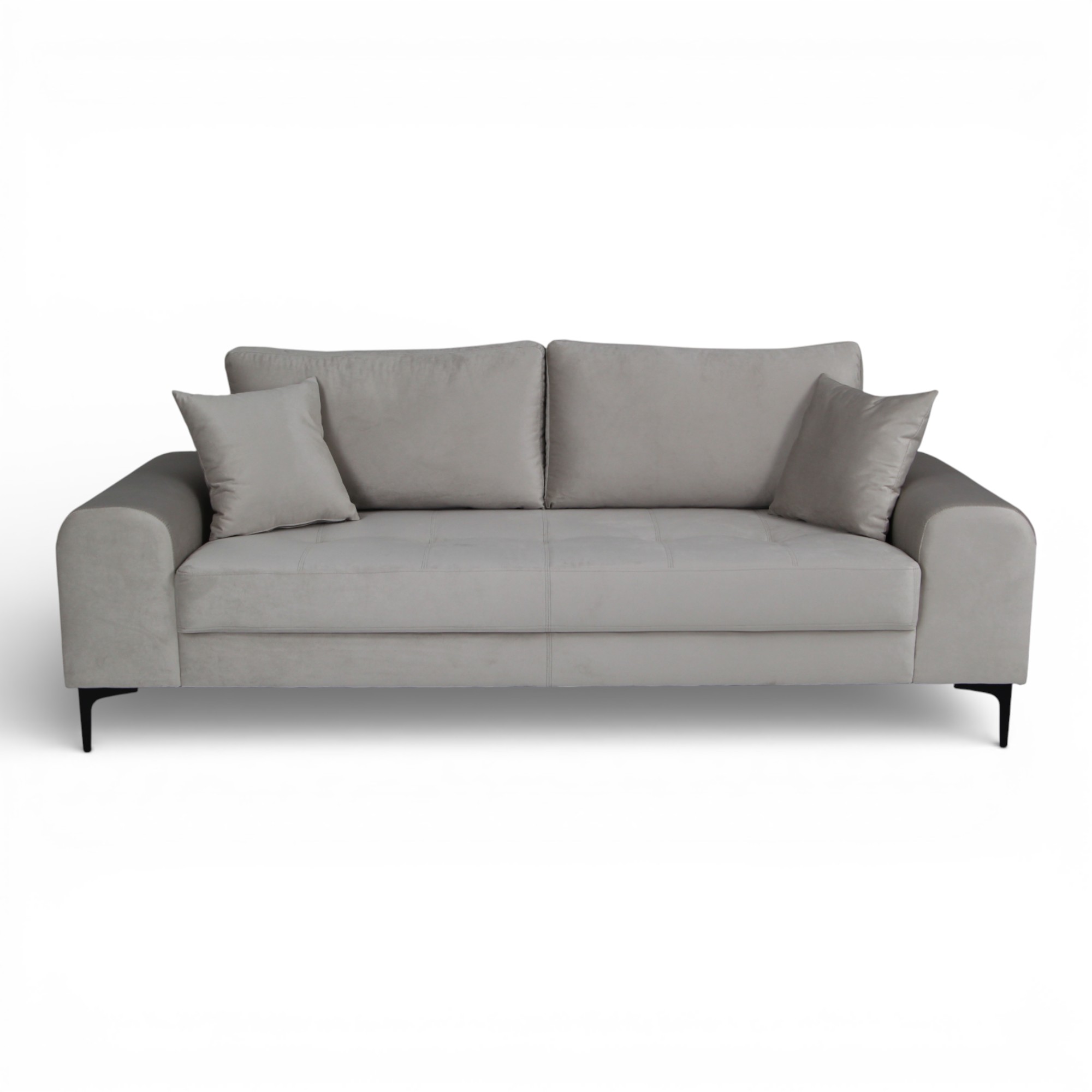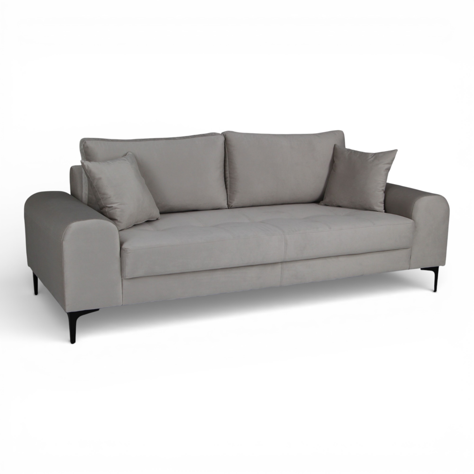 Wide, low armrests with gently curved tops define the sofa’s bold silhouette. These broad arms not only enhance the modern design but also offer a practical surface for resting a book or remote. The single full-width seat cushion creates a smooth seating area with no gaps, which is especially useful in busy households. Fewer gaps mean fewer places for small items to disappear, while the seamless design keeps the sofa looking tidy. Button tufting across the seat cushion adds subtle texture and visual interest. At the same time, it helps the cushion hold its shape for longer. The sofa sits on sleek metal legs, which lift it slightly from the floor and give it a light, contemporary finish. Two scatter cushions complete the look and add extra comfort.