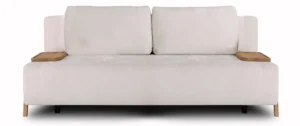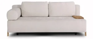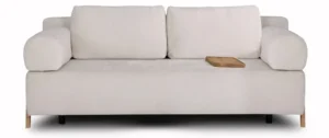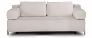 Four heavy-duty plastic legs, together with stylish wooden side legs, provide sturdy support. Moreover, Tiny includes hidden under-seat storage. Remove the back cushions and pull the seat base to reveal a drawer-style compartment. It’s ideal for blankets, guest bedding, or other items you want to keep out of sight.