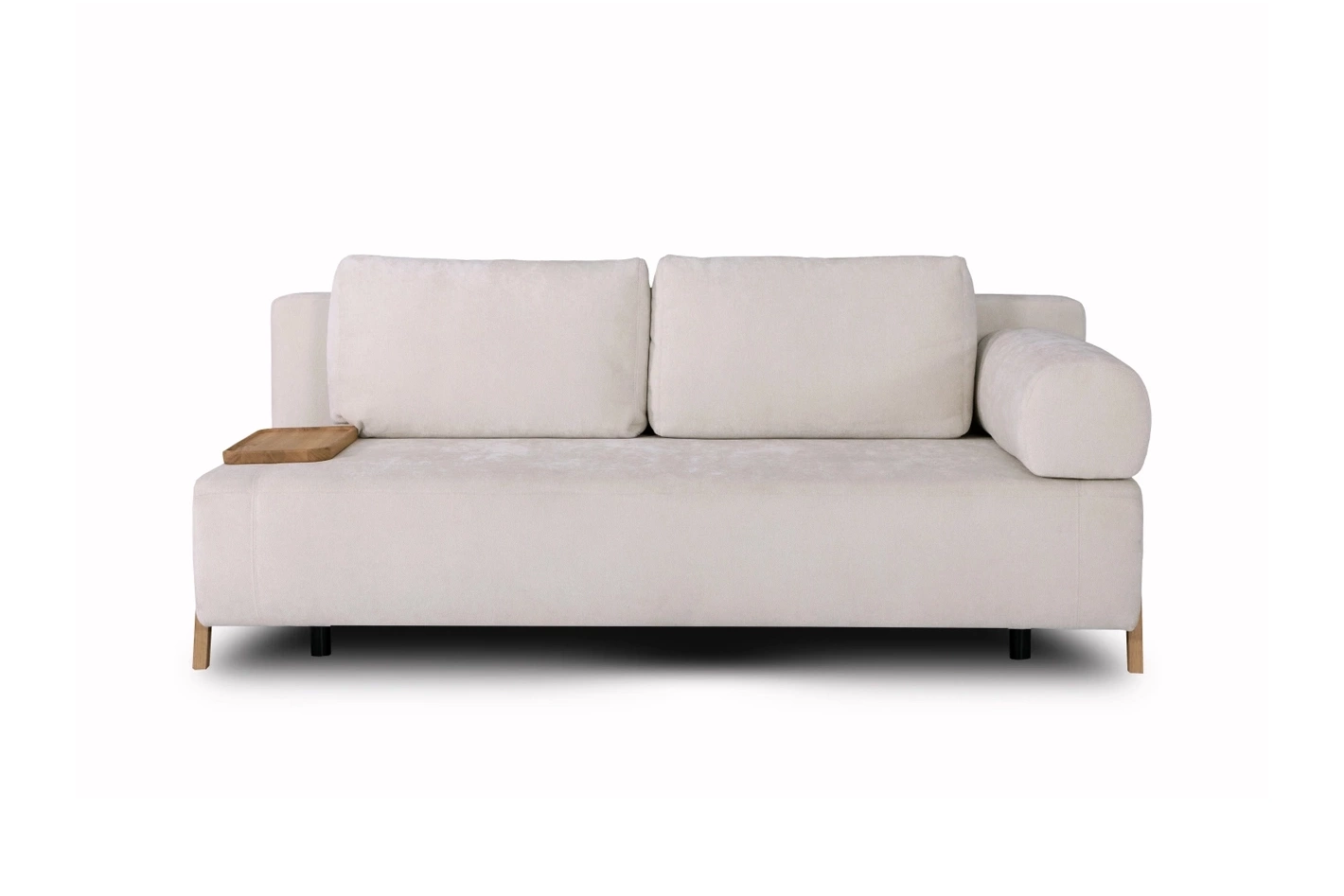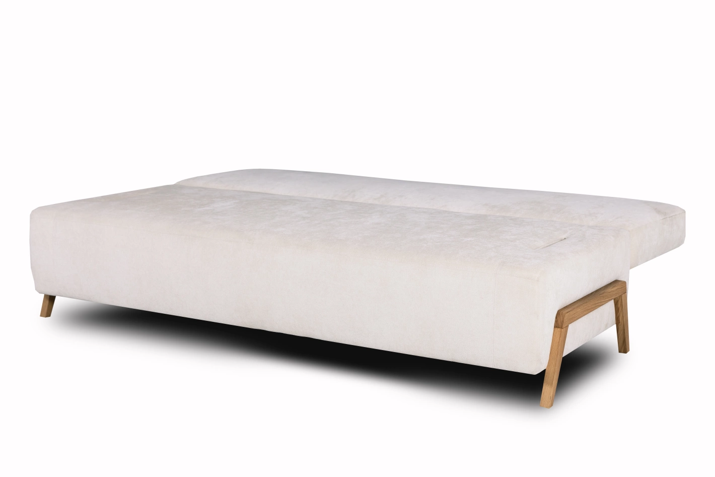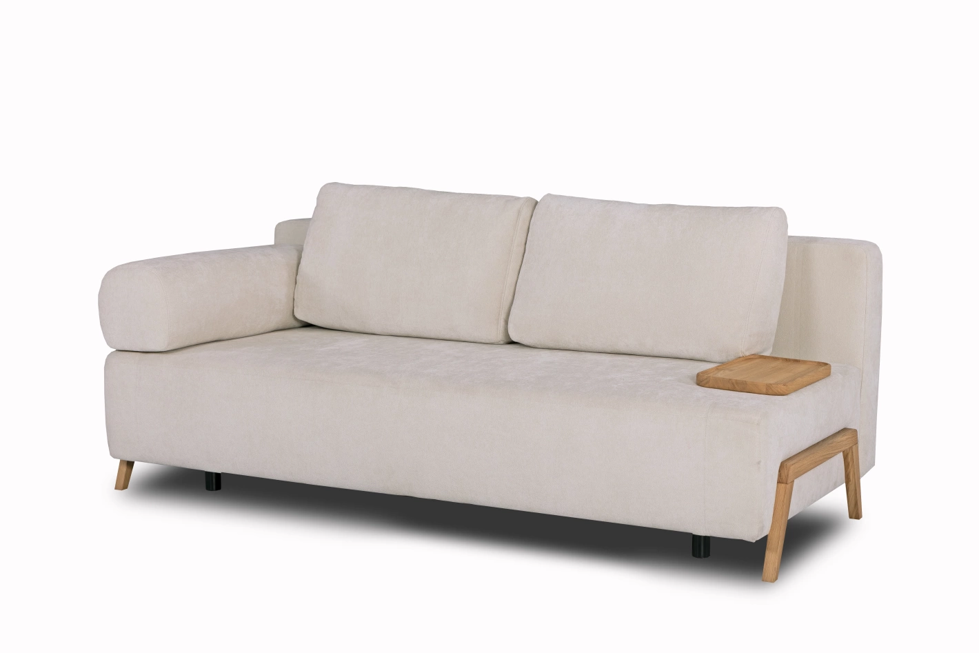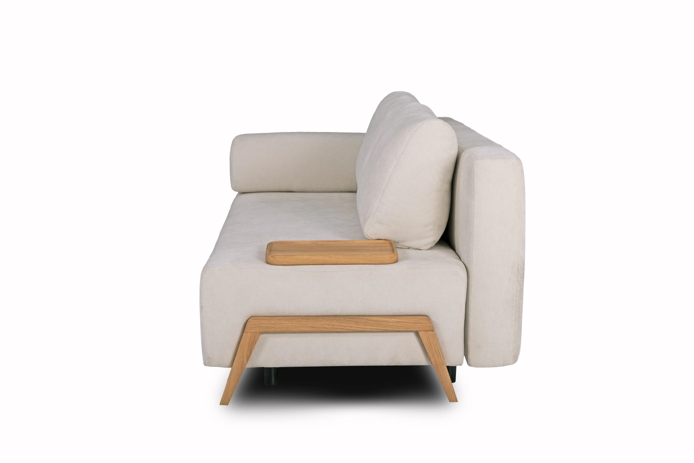 Four heavy-duty plastic legs, together with stylish wooden side legs, provide sturdy support. Moreover, Tiny includes hidden under-seat storage. Remove the back cushions and pull the seat base to reveal a drawer-style compartment. It’s ideal for blankets, guest bedding, or other items you want to keep out of sight.